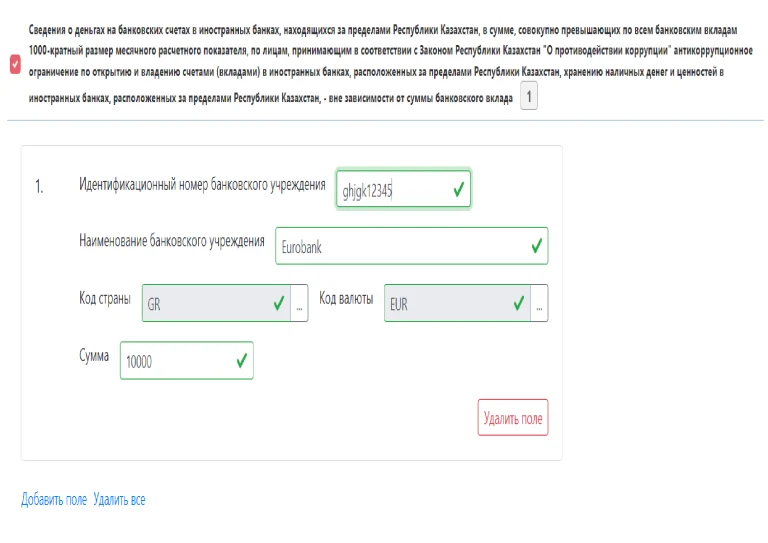 Если у вас есть что задекларировать из этого списка, напротив пункта поставьте галочку >> нажмите «Добавить поле» >> Заполняете поля. Открывшиеся поля вбиваете самостоятельно или выбираете из списка, нажав на три точки. Если по какому-то пункту нужно указать несколько активов или обязательств, то нажмите «Добавить поле» и откроется дополнительное поле для заполнения.